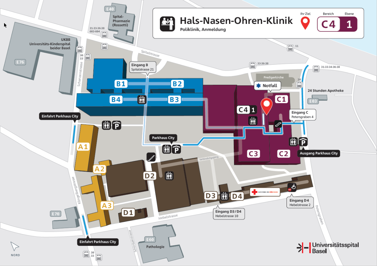 | Mit der Tramlinie 11 bis zur Station Universitätsspital fahren und dann zu Fuss knapp 80m dem Petersgraben bis zum Eingang folgen. |