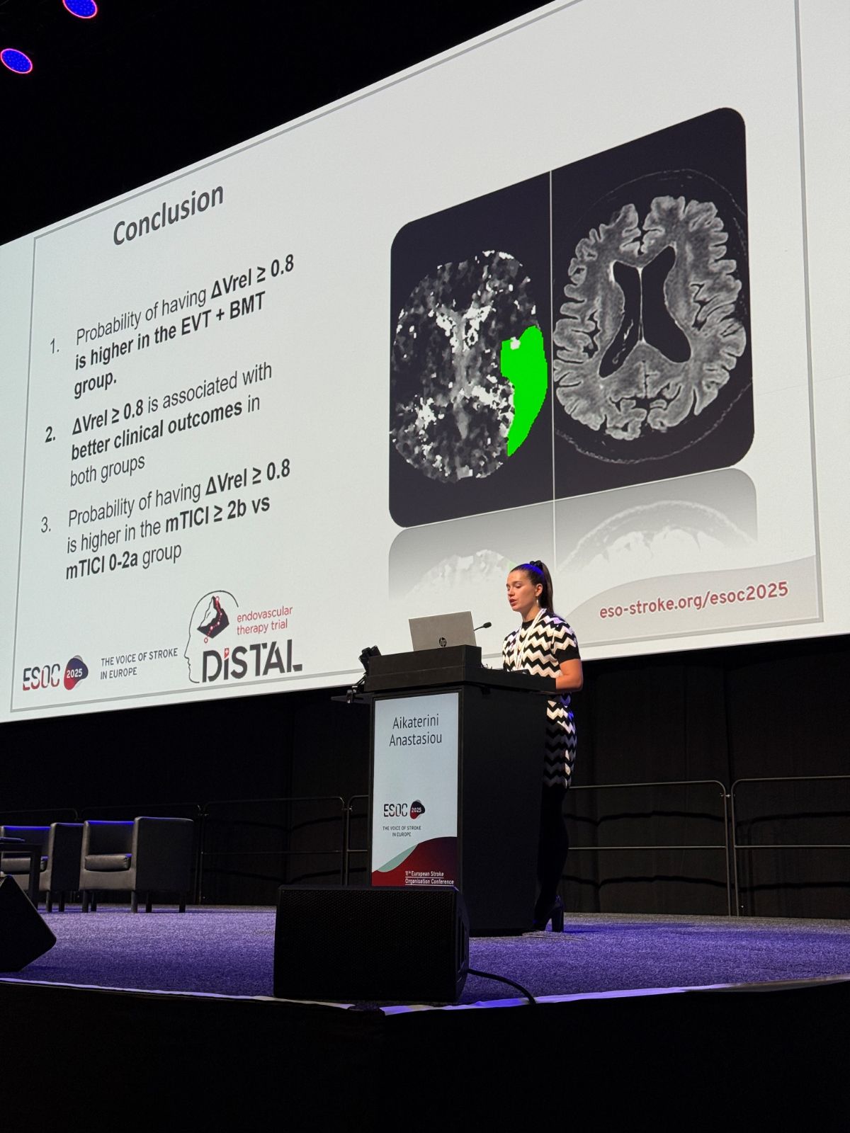 Aikaterini Anastasiou, Assistenzärztin der Radiologie und Kandidatin des MD-PhD Programms der Universität Basel, präsentiert ihre Ergebnisse zur endovaskulären Schlaganfallbehandlung bei Verschlüssen der mittelgrossen Hirnarterien anlässlich deren Würdigung als Conference Highlight an der ESOC, der weltweit grössten Schlaganfall-Konferenz.