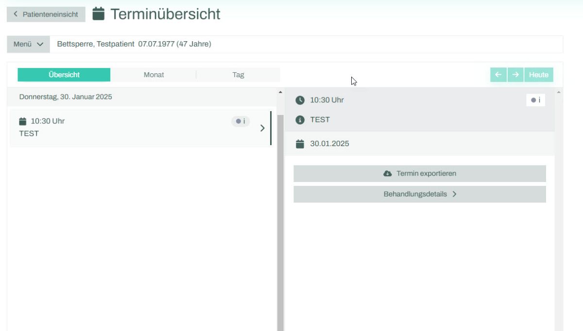 Vergangene (letzte 14 Tage) und anstehende Behandlungstermine Ihrer Patientinnen und Patienten können im Zuweiserportal eingesehen werden.