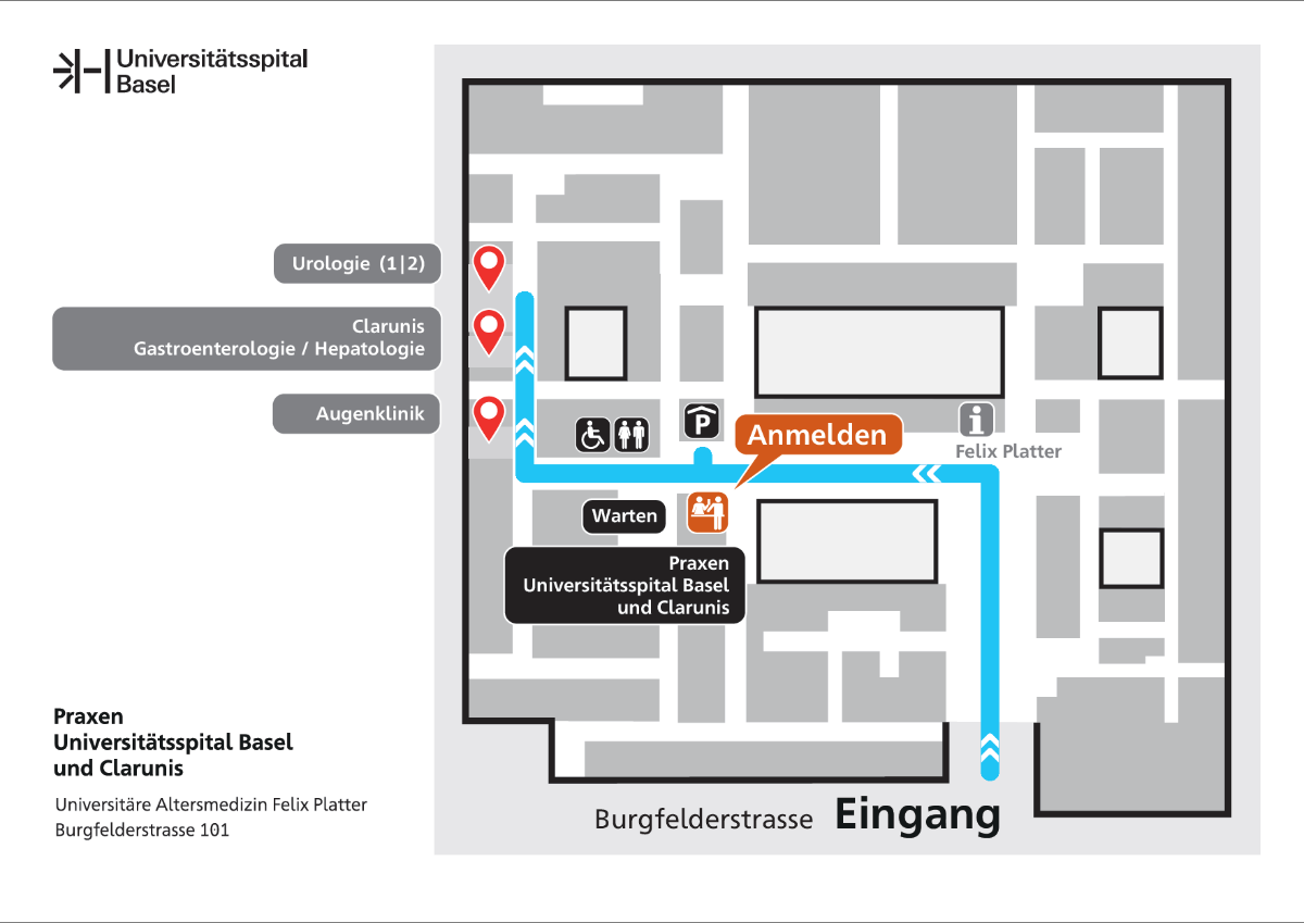 Die Praxis der Urologie befindet sich im Erdgeschoss der Universitären Altersmedizin Felix Platter. Sie finden uns indem Sie den Haupteingang benutzen und bis zur Hauptanmeldung laufen. Danach müssen Sie nach links gehen und sich dort an der Anmeldung melden. Sie werden dann von unserem Pflegepersonal abgeholt.