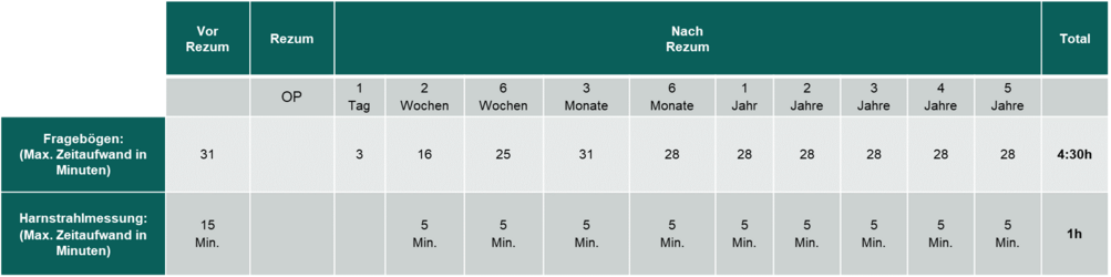Als Studienpatient werden Sie gebeten, zu bestimmten Befragungszeitpunkten verschiedene Fragebögen zu beantworten. Diese werden Ihnen per Email-Link über die Studiendatenbank zugesandt und können so bequem zuhause ausgefüllt werden. Ebenfalls erhalten Studienpatienten kostenlos ein Harnstrahlmessgerät (Smartphone App mit KI (Künstliche Intelligenz) für die Harnstrahlmessung zuhause. Die so erhobenen Daten werden automatisch via App und Smartphone in die Studiendatenbank des Universitätsspitals Basel übermittelt. Den Zeitaufwand, die Befragungs-, als auch Messzeitpunkte können Sie der unten angefügten Tabelle entnehmen.